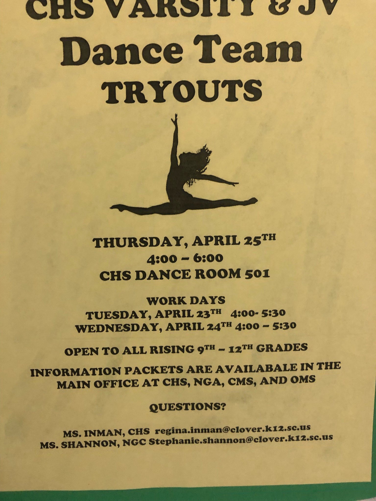Clover High School On Twitter Dance Team Tryouts This Week See Flyer For Work Days And Tryout Date